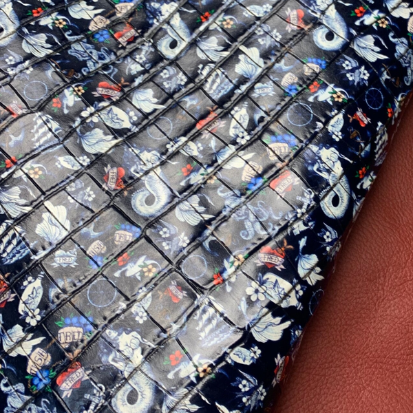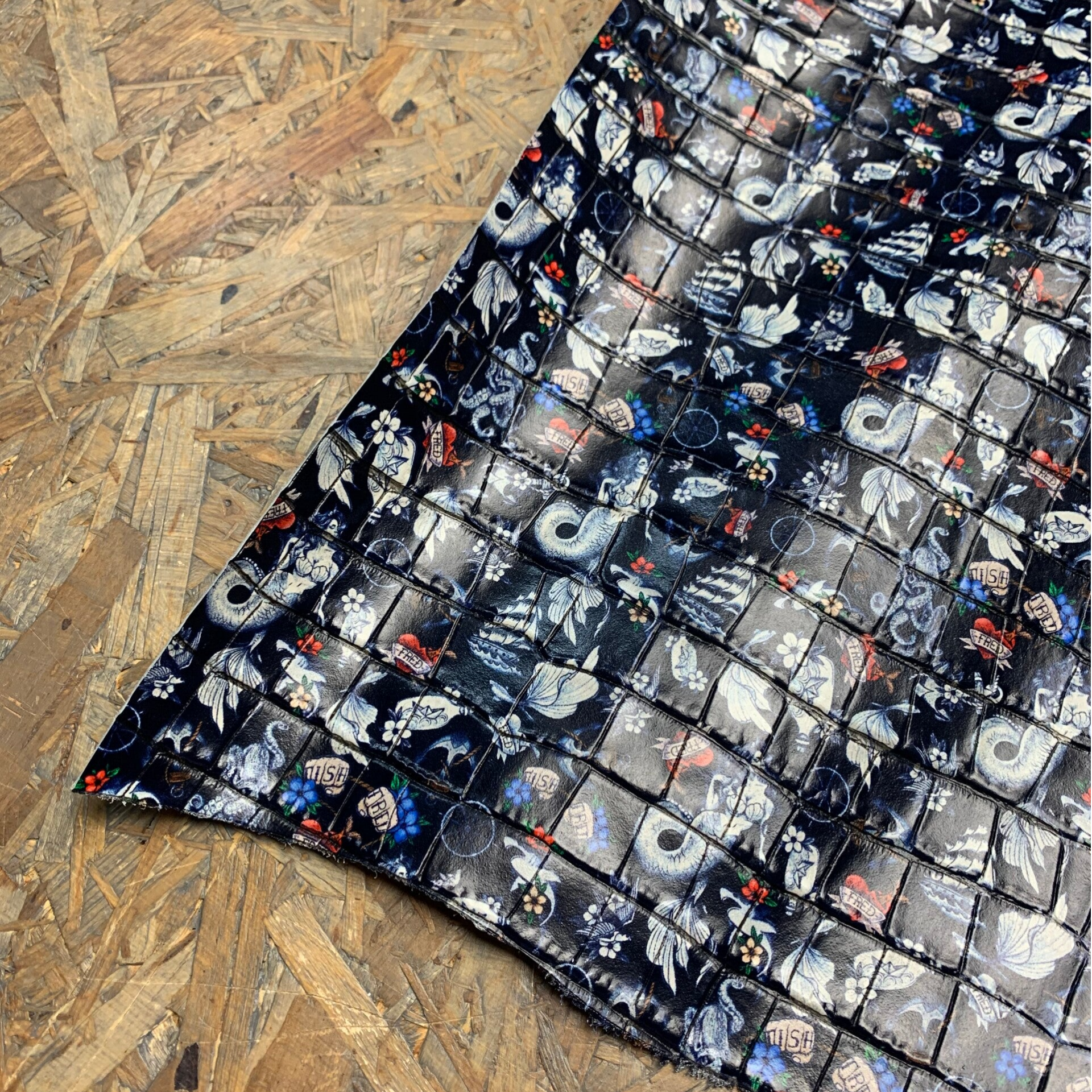 Een stugge leren lap met fantasie zeeprint in de kleuren blauw, wit, rood, aqua