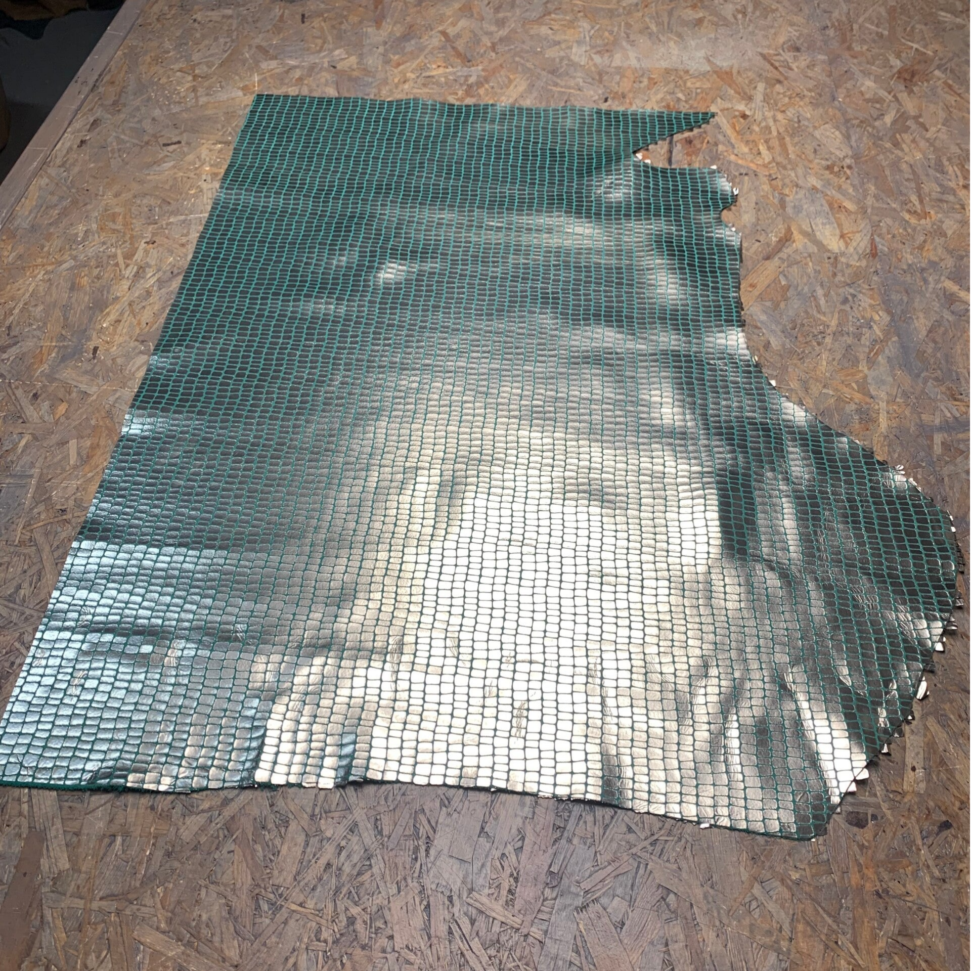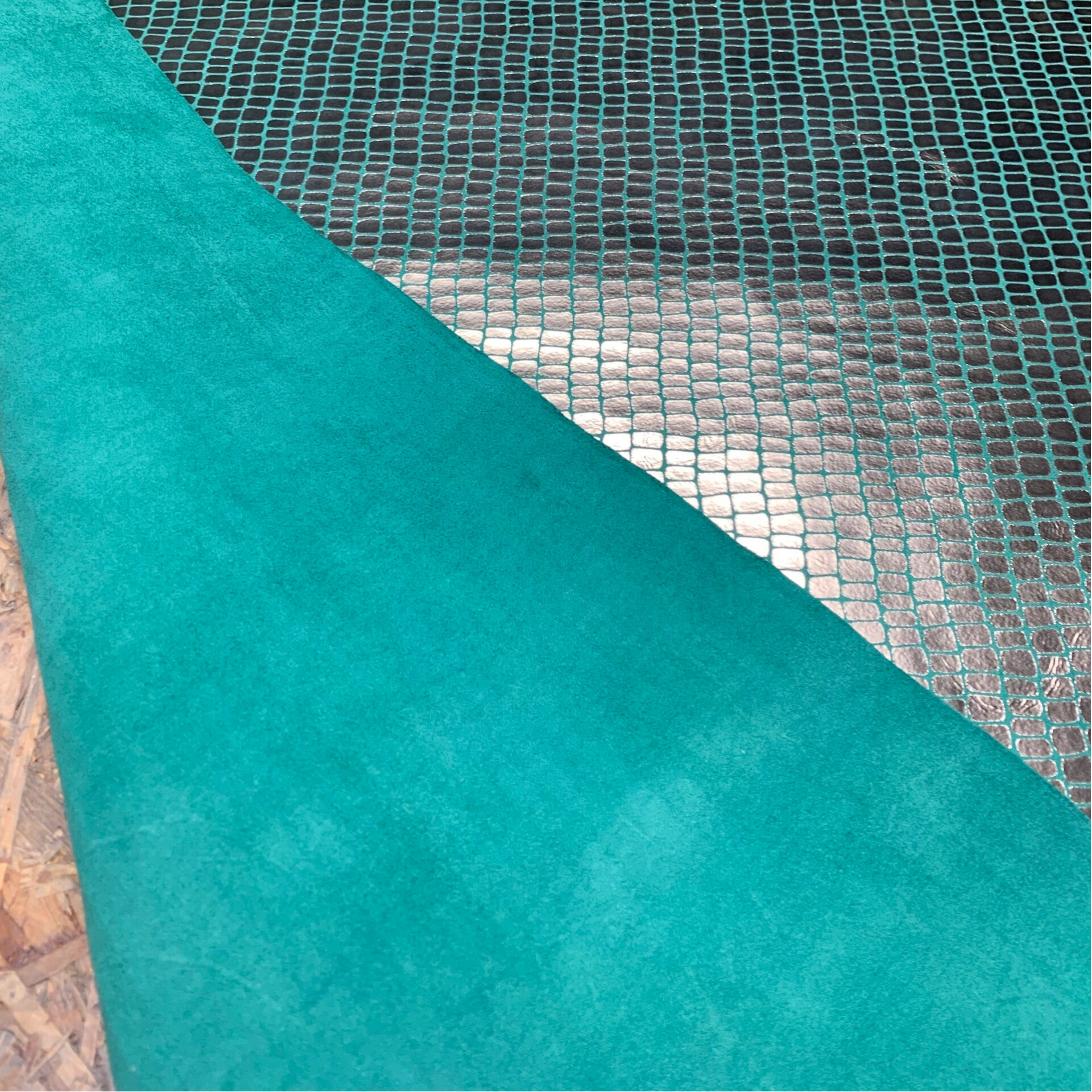 Een glimmende zilver groene leren lap met prachtige bruikbare groene achterkant