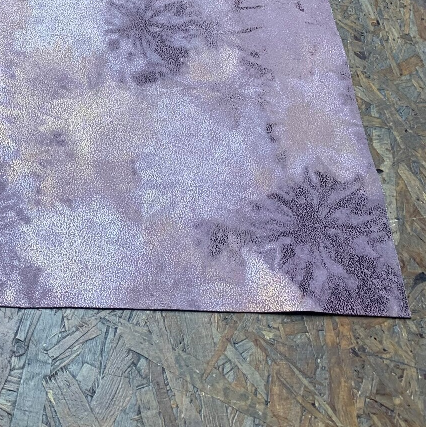 Een prachtige stevige doch soepele roze leren lap met paars en gouden bloemenprint, met mooie achterkant