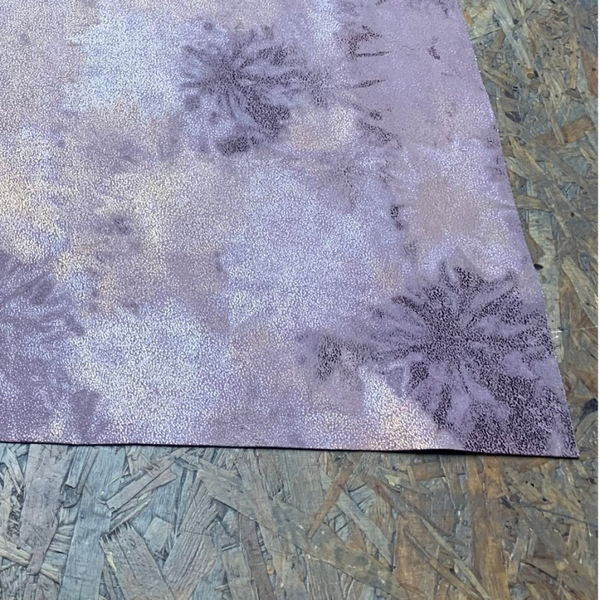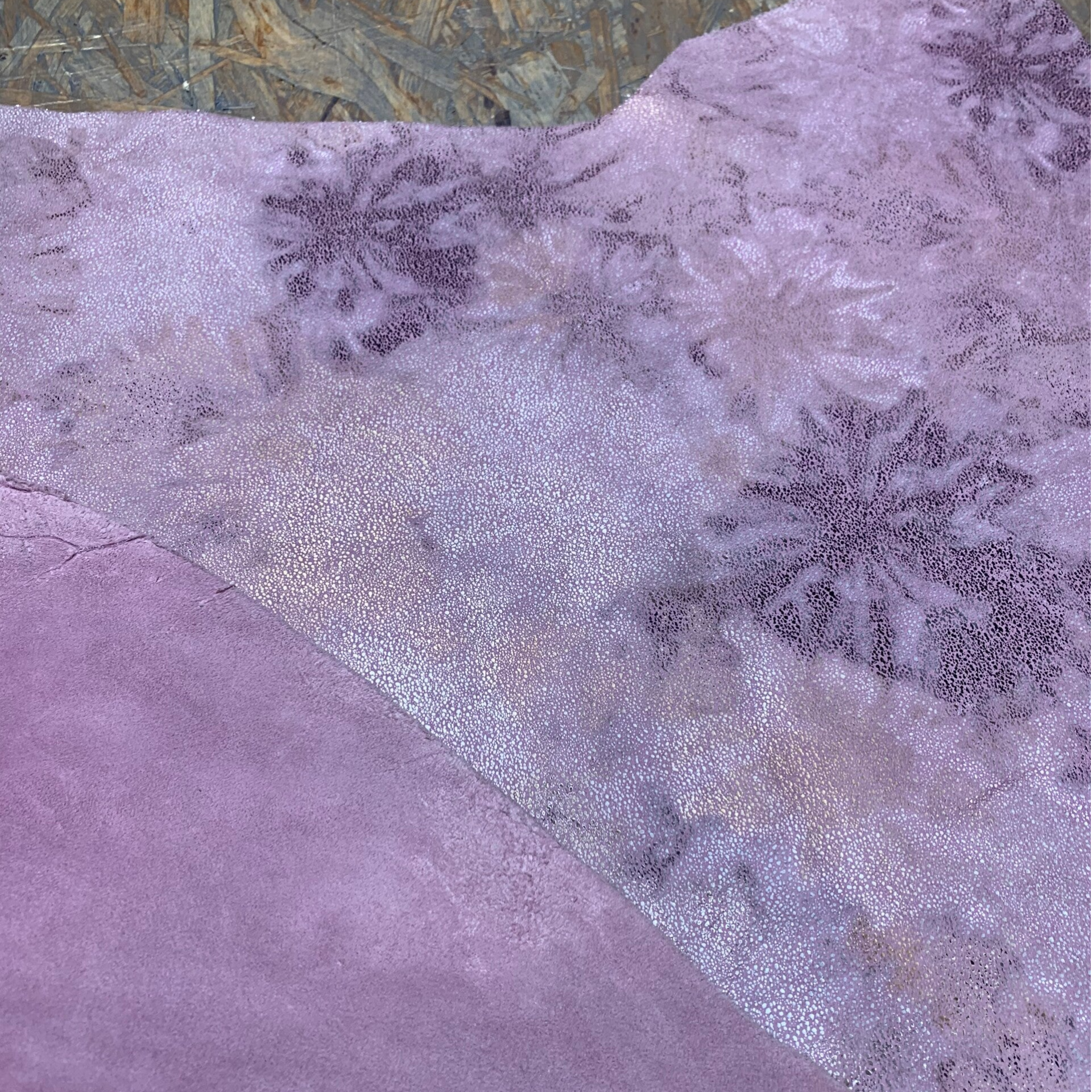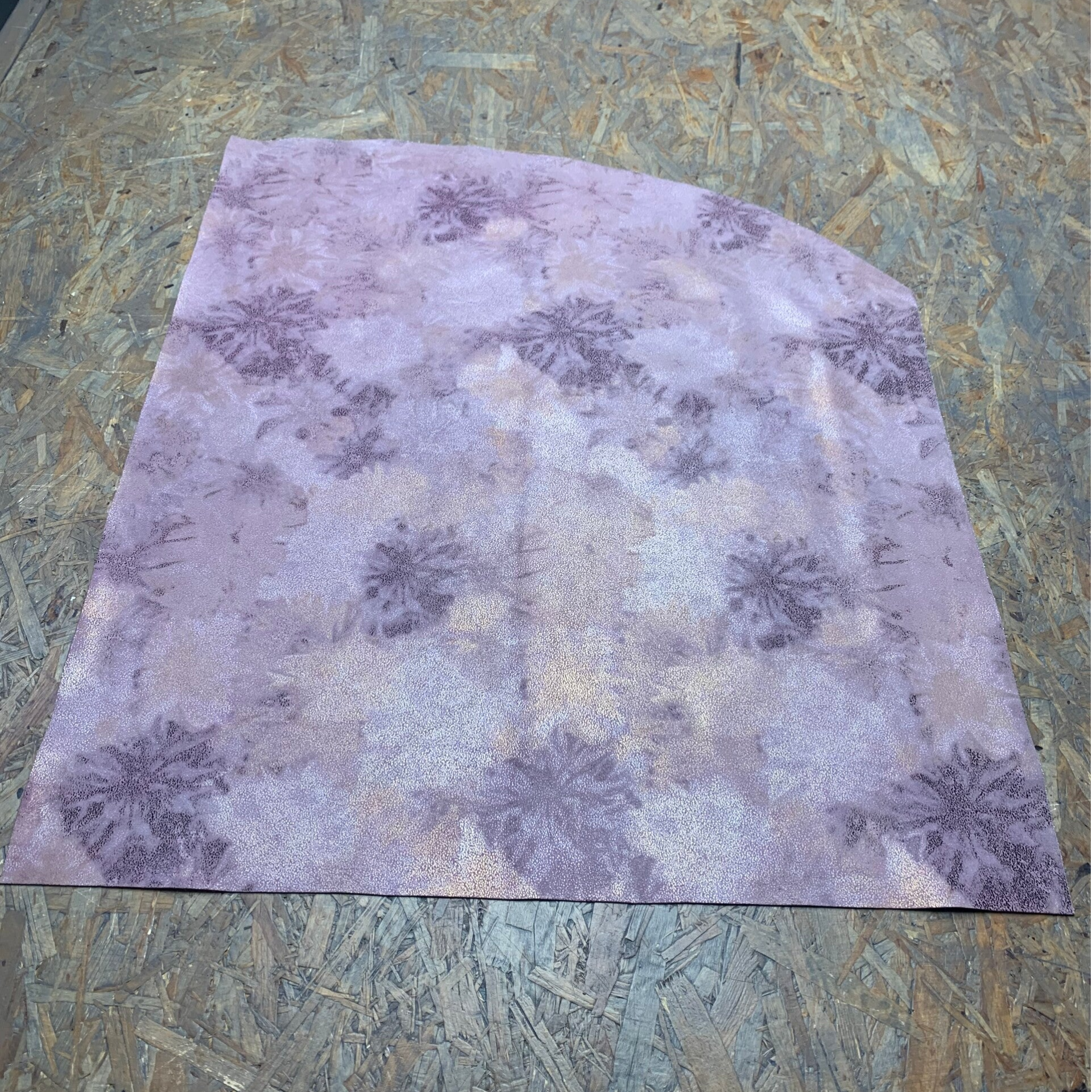 Een prachtige stevige doch soepele roze leren lap met paars en gouden bloemenprint, met mooie achterkant