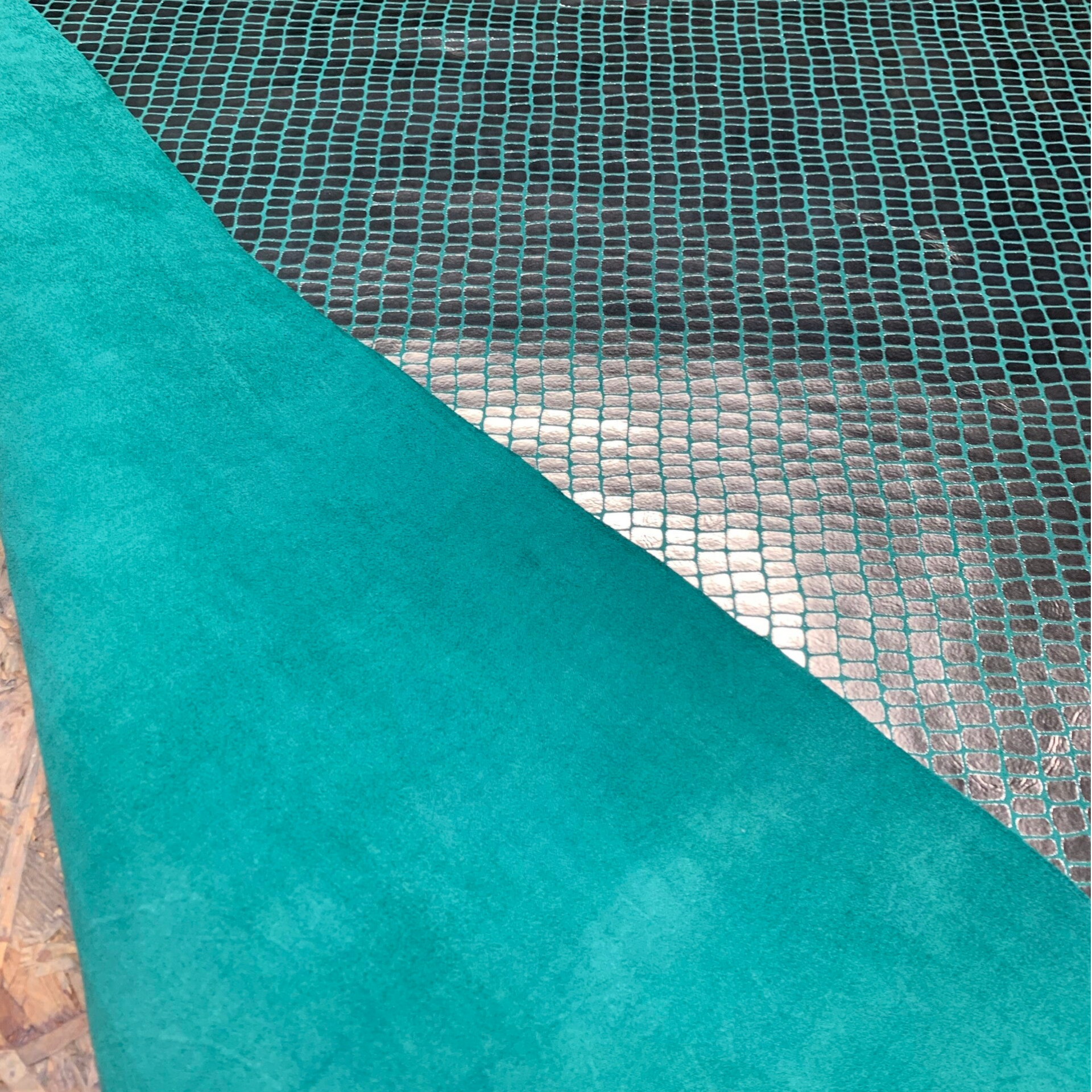 Een soepele doch stevige glimmende zilver groene leren lap met prachtige bruikbare achterkant