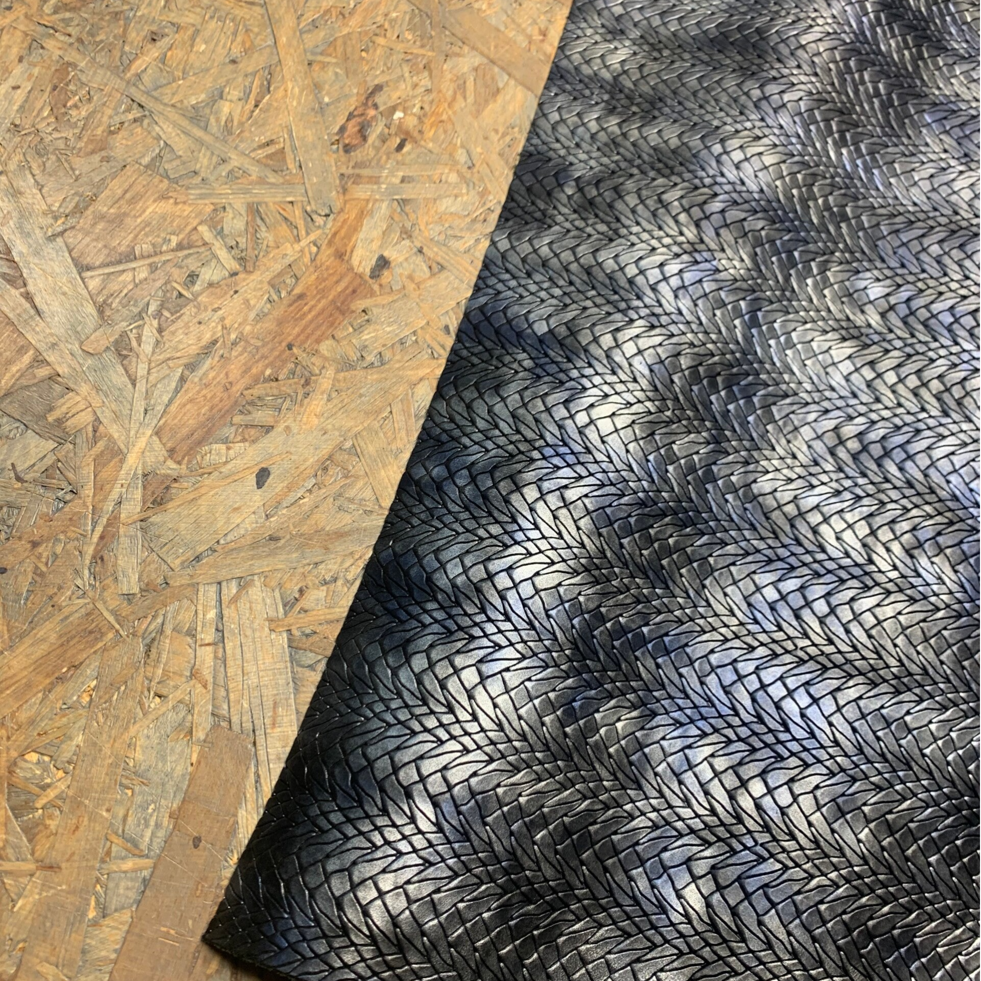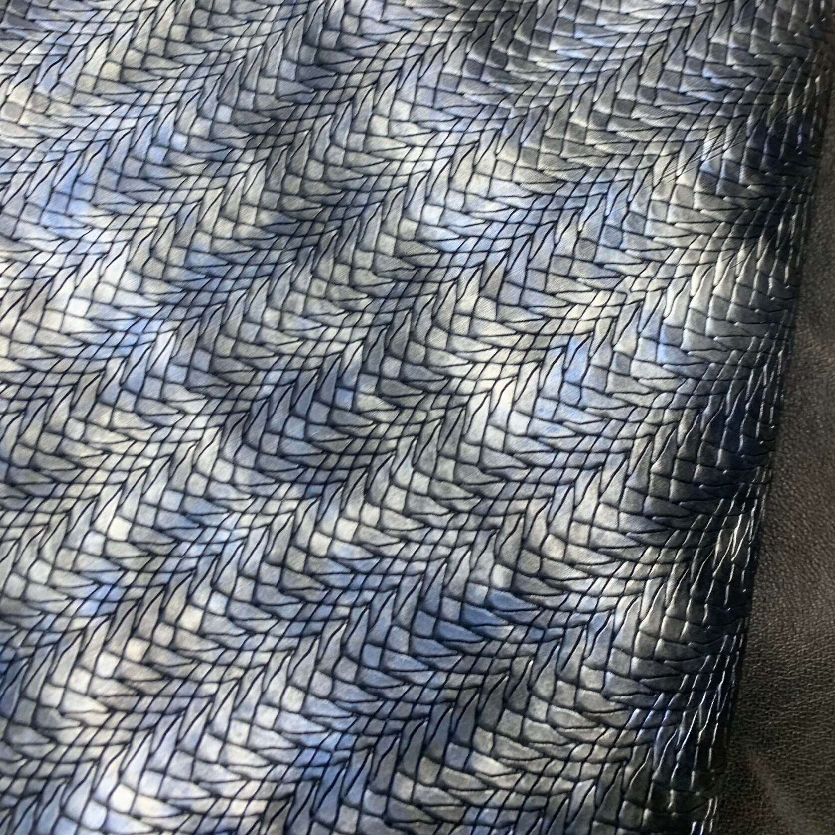 Een wat stugge zilverblauwe, zwarte pyramide patroon leren lap