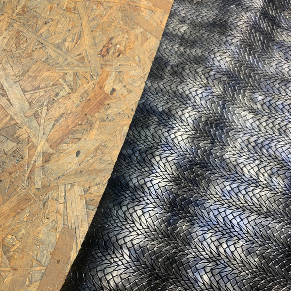 Een wat stugge zilverblauwe, zwarte pyramide patroon leren lap