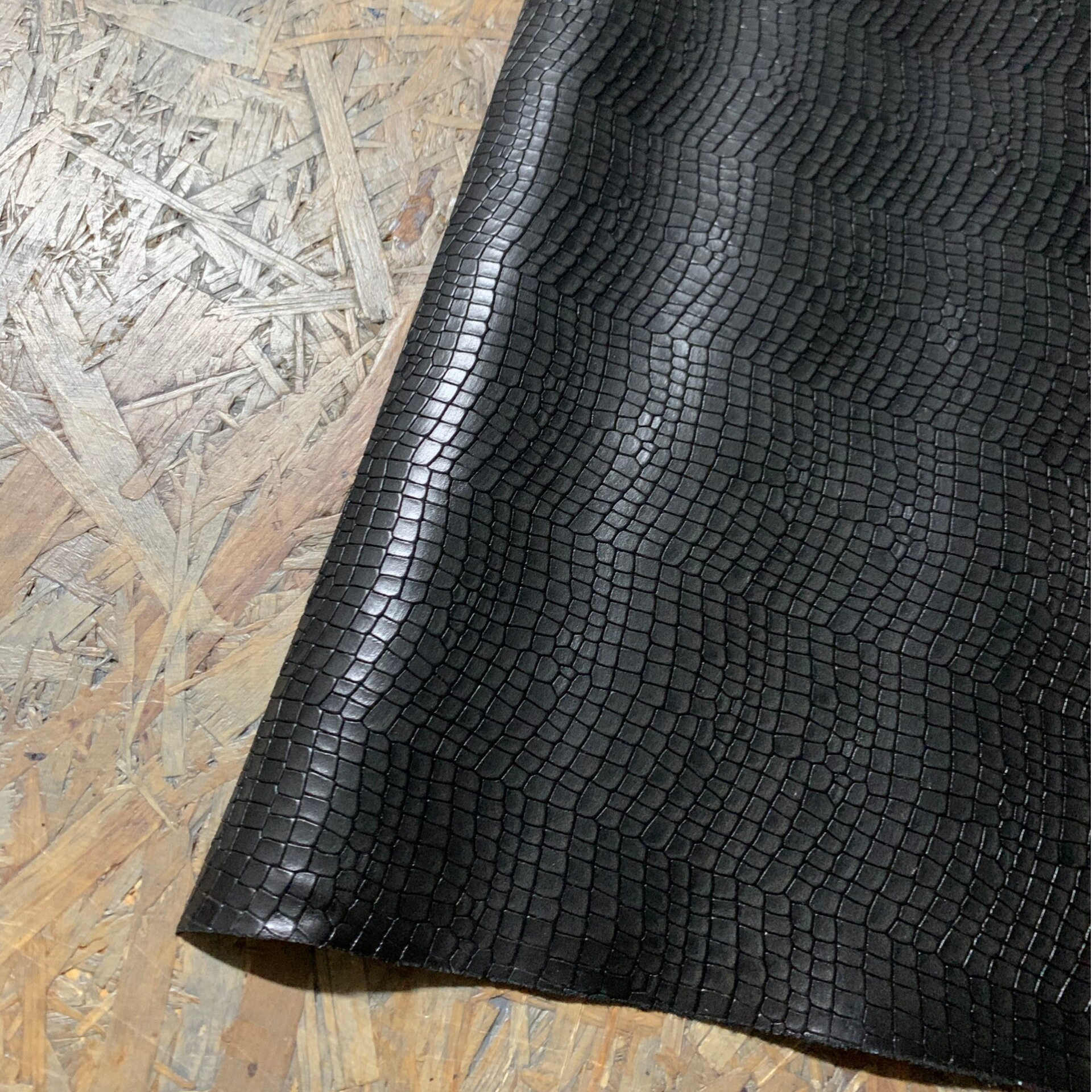 Een prachtige soepele zwart-donkergrijs reptiel leren lap