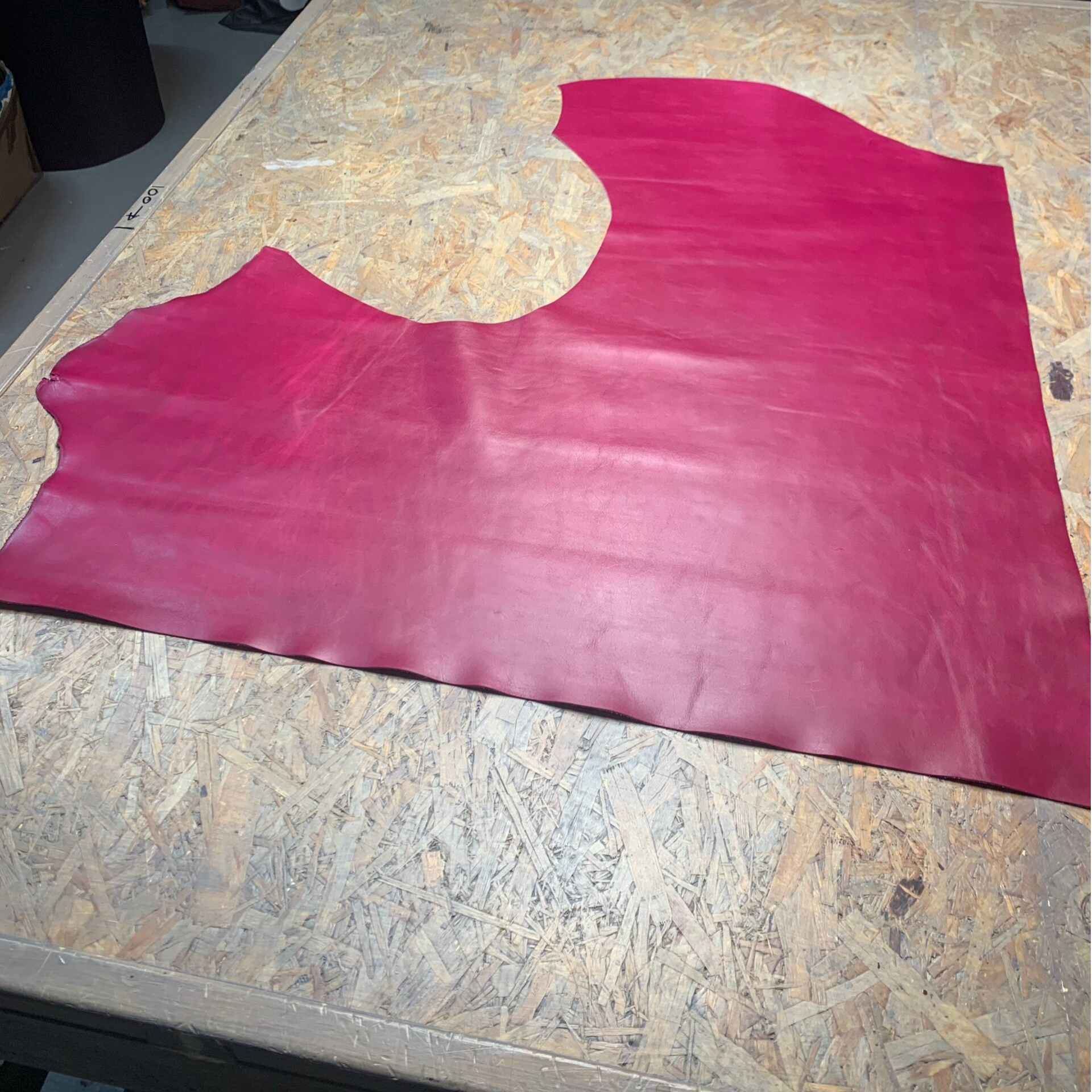 Een gladde wat stugge donkerfuchsia leren lap, ziet er wat gemeleerd uit