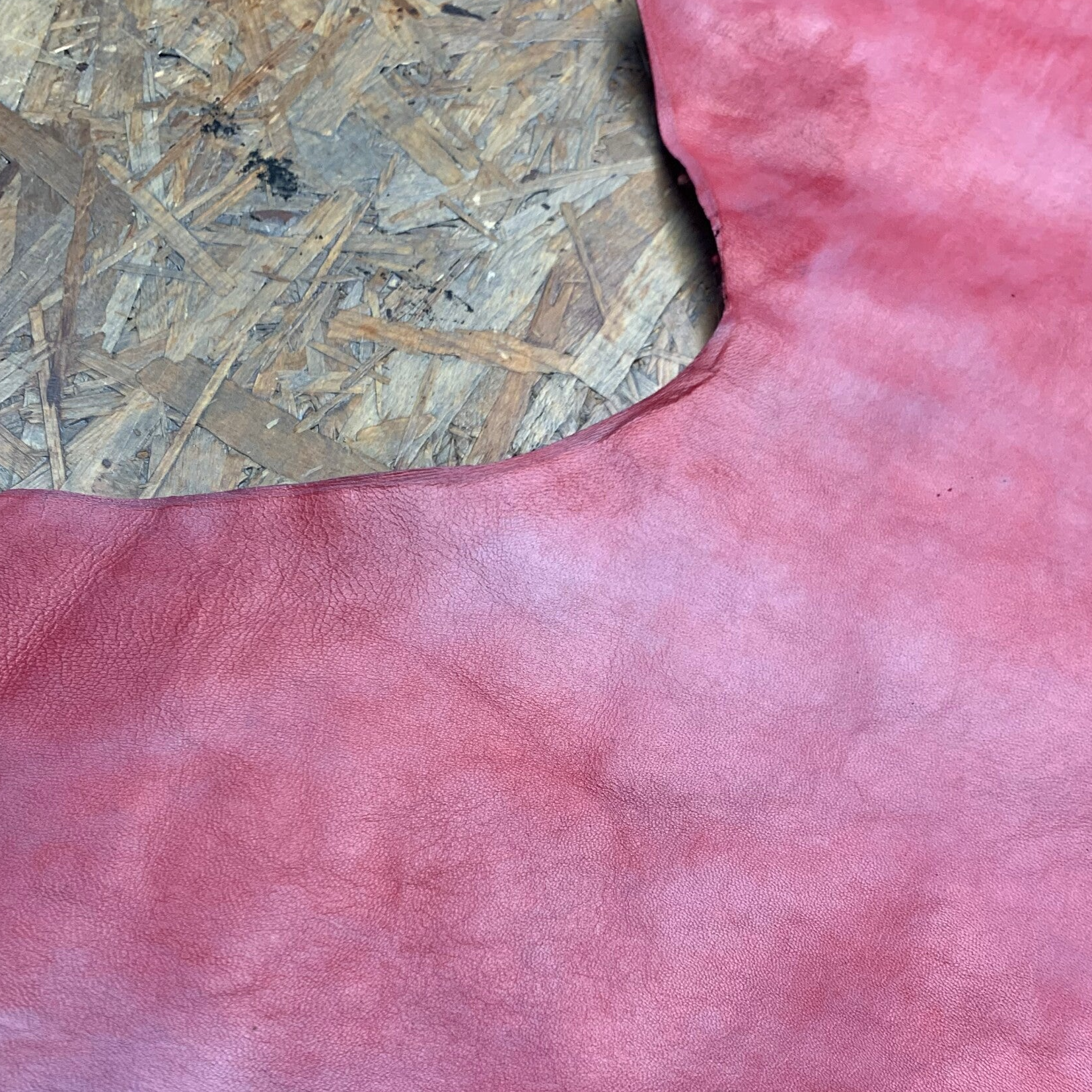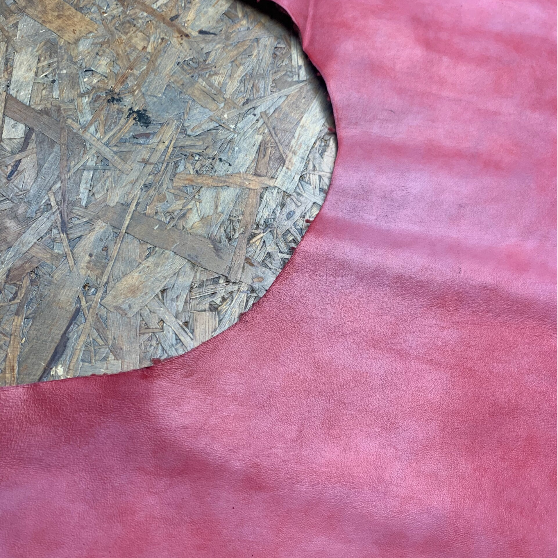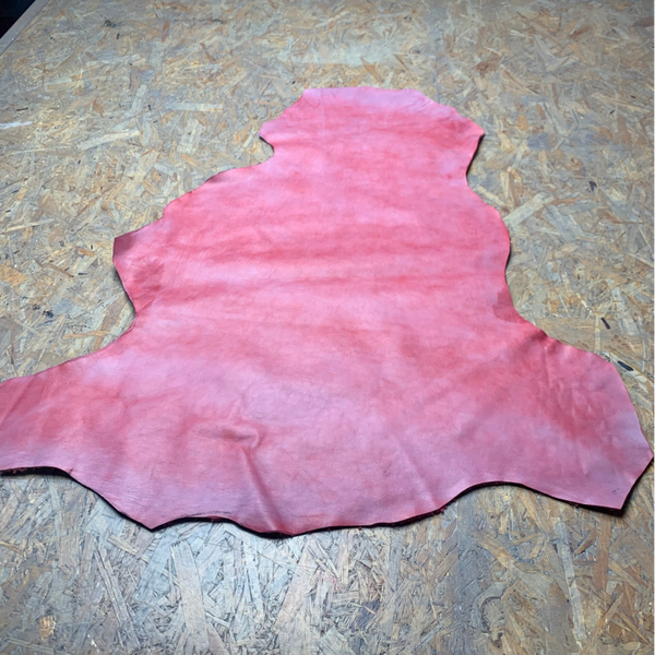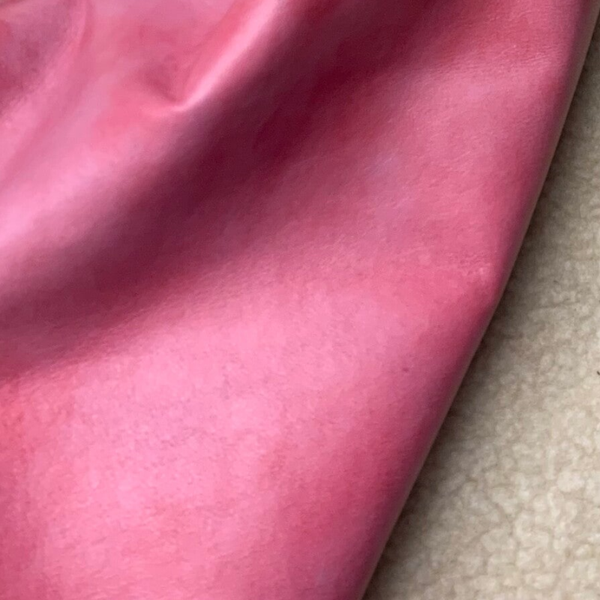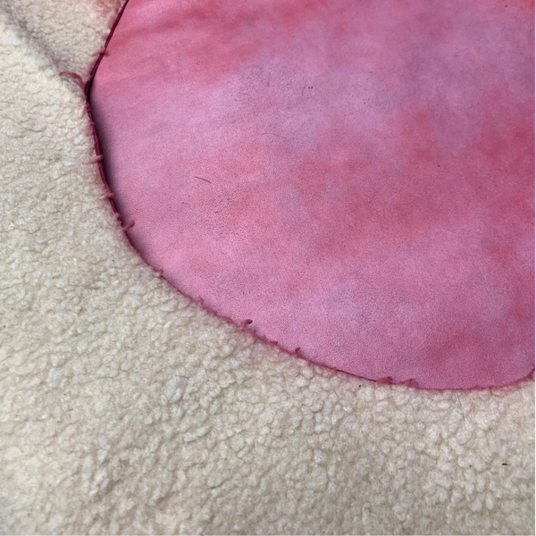 Een gemeleerd roze leren lap met aan de achterkant een teddy, ideaal voor de binnenkant van een tas